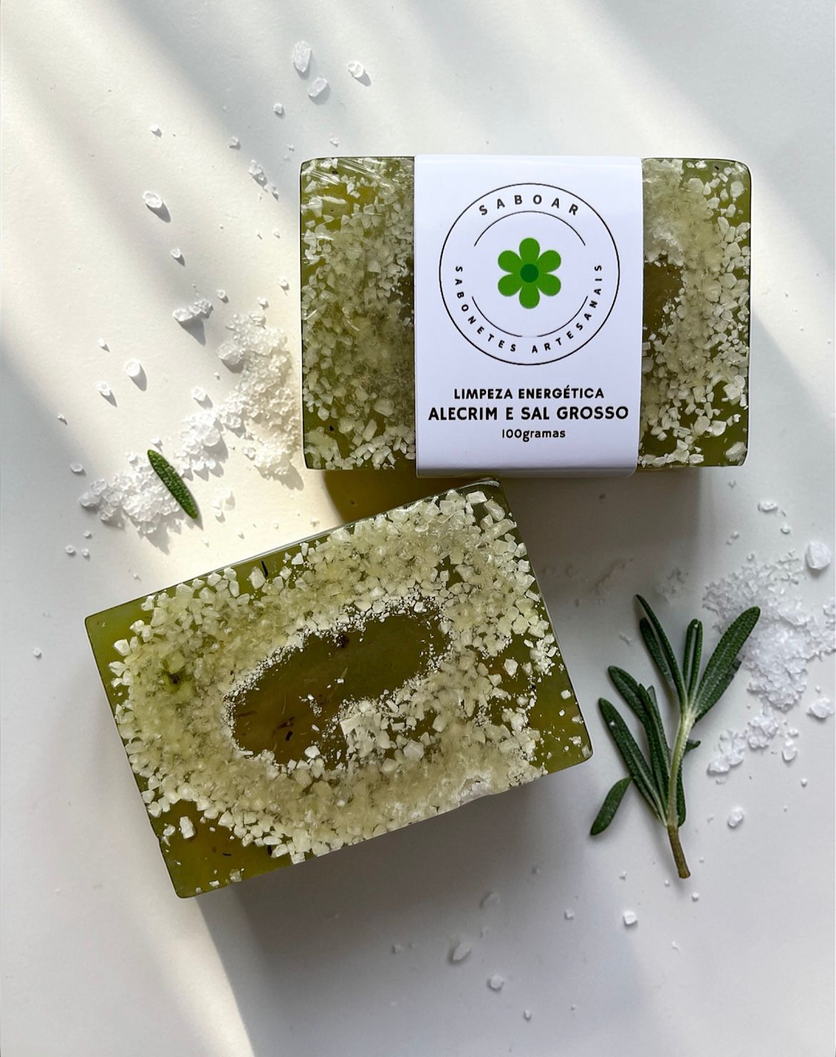 Transforme o seu banho em um ritual de limpeza e equilíbrio. Este sabonete artesanal une o frescor revitalizante do alecrim com o poder purificante do sal grosso, promovendo bem-estar para o corpo e para a mente.