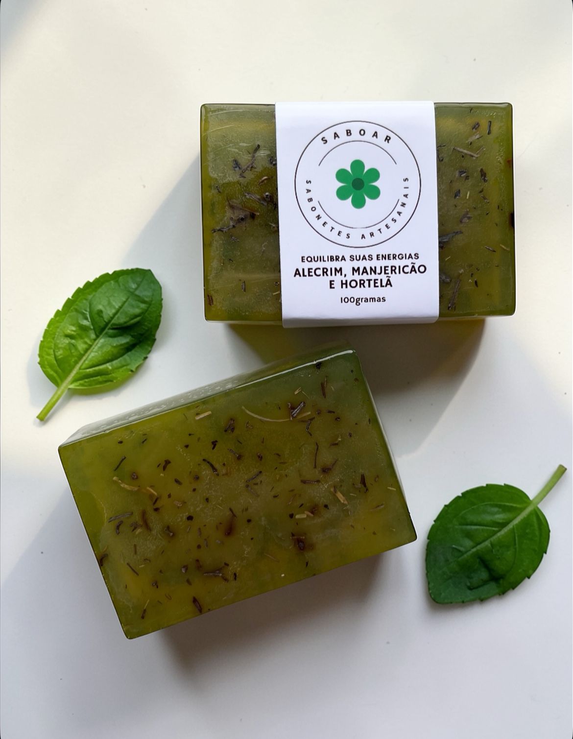 Composição: Base glicerinada, essência de alecrim lelis, extrato de alecrim, lauril vegetal de coco, corante cosmético, alecrim, manjericão e hortelã desidratados.