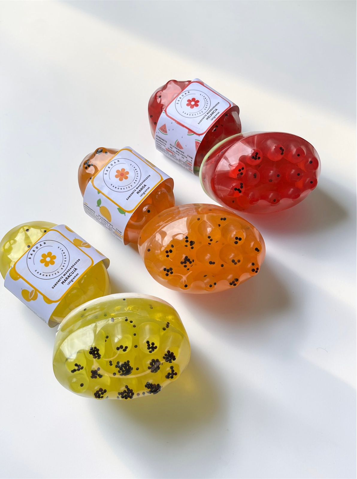 Composto por 3 sabonetes massageadores – Melancia, Maracujá e Manga – cada unidade possui um formato com relevos que estimula a circulação enquanto limpa a pele, proporcionando uma leve massagem relaxante durante o banho.
